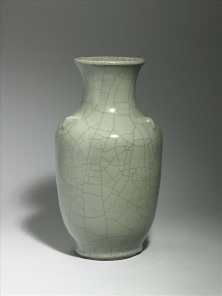 撇口,束腰頸,斜肩,肩部平均貼飾暗耳三枚,碩腹下斂,淺圈足。全器內外施哥釉,釉色粉青,勻潤透亮,有冰裂、灰黑色開片紋。圈足露胎處塗淺棕色汁。