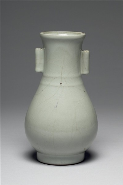 撇口,短頸,雙貫耳,碩腹,圈足,口緣有舊傷缺。頸部飾凸弦紋二道,全器滿施淺青仿官釉,釉色勻淡,滿佈冰裂開片紋。圈足露胎,塗赭色汁。
