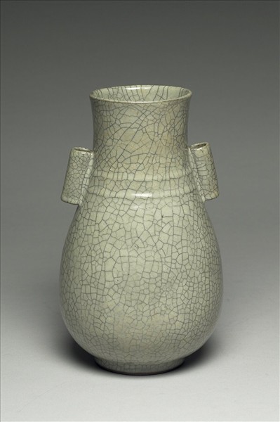 撇口,短頸,雙貫耳,碩腹,淺圈足。通體施灰青仿哥釉,釉面滿佈細碎開片紋,頸部有凸弦紋二道。圈足露胎,塗赭色汁。