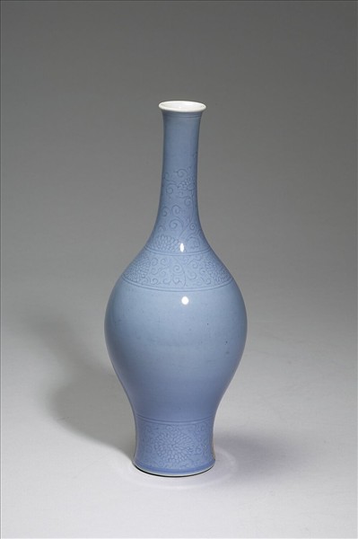 小口微撇,細長頸,橄欖形深腹,璧形足。器身施天藍釉,釉面勻淨,頸、肩、足部劃多道弦紋為界,暗刻菊花,刻線清晰流暢。器內與底心施白釉,底外璧足露白胎,質堅細膩。