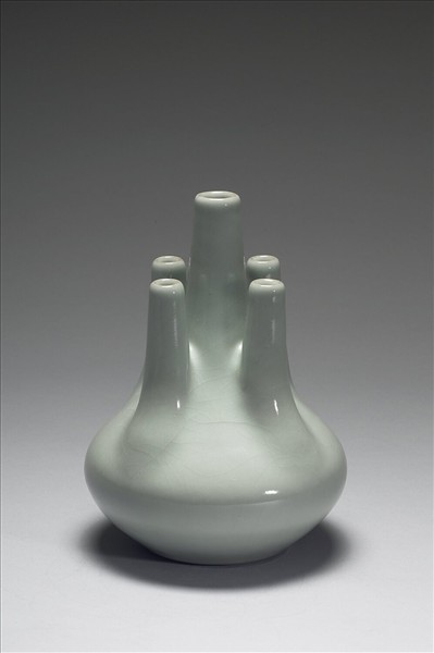 瓶頸作管狀五孔造型。除中間束管較高外,餘皆等高。全器施仿汝青瓷釉,釉色均勻,呈粉青色,口沿呈淺褐色,器壁有燒漬璺,器表開大紋片。圈足底緣仿宋代官窯紫口鐵足,塗深褐色護胎汁。底施青釉,以青花書「大清乾隆年製」六字三行篆款。瓶具五管之造型或不始於清雍正時期,但從雍正四年(1726)造辦處的檔案記事以及傳世品所見,得知除了五管瓶之外,雍正官窯亦燒造雙連瓶,四管瓶和六管花插,且其造型概念與前代作品有所不同。關於此類作品蔚為流行的原因,背後或存在一些無法追溯的因素。不過,或因多管造型比較接近西洋立體概念,足以表現出光線照射的變化。故被具有繪畫素養的督陶官年希堯採用為《視學》一書中的插圖。《視學》為編譯自義大利畫家Andrea Pozzo的《繪畫與建築透視》一書而來的中文譯著,首刊於雍正七年(1729),今日所見皆為雍正十三年(1735)的再版本。年希堯著手翻譯之際,不僅以自身監造之官窯瓷器取代原書所附的插圖,說明西洋單點透視的原理,同時也間接傳達出督陶官所使用的作品,或是當時人心目中所認為足以傳達西洋透視觀念的器形。