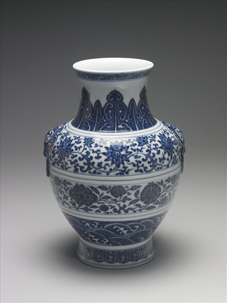 圓口外侈,短頸,豐肩圓弧腹,圈足外撇,肩帶銜環鋪首雙耳。口緣波濤紋一圈,頸飾蕉葉,腹壁以轉枝番蓮與波濤紋為飾,足邊蓮瓣紋一圈。器底青花「大清乾隆年製」三行六字篆款。