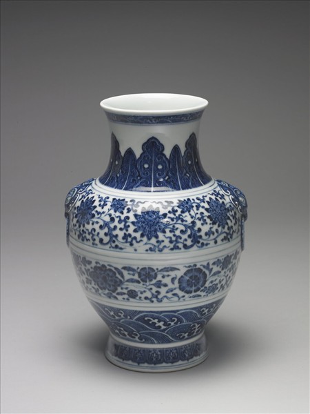 圓口外侈,短頸,豐肩圓弧腹,圈足外撇,肩帶銜環鋪首雙耳。口緣波濤紋一圈,頸飾蕉葉,腹壁以轉枝番蓮與波濤紋為飾,足邊蓮瓣紋一圈。器底青花「大清乾隆年製」三行六字篆款。