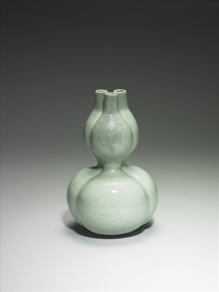 三連葫蘆瓶,器式為三葫蘆作「品」字排列併接而成,三瓣形足。全器施罩冬青釉,釉色勻淨瑩潤,惟部分有裂痕與補痕,圈足露胎,塗褐色汁,足內青釉地「大清乾隆年製」三行六字鈷藍篆款。