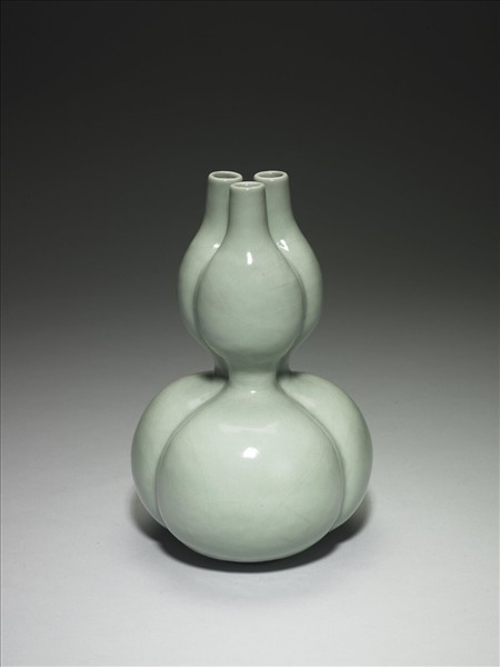三連葫蘆瓶,器式為三葫蘆作「品」字排列併接而成,三瓣形足。全器施罩冬青釉,釉色勻淨瑩潤,圈足露胎,塗褐色汁,足內青釉地「大清乾隆年製」三行六字鈷藍篆款。