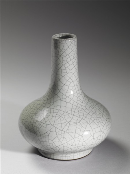斂圓口,細長頸,扁圓腹,圈足。通體施仿哥釉色,色灰青,釉面佈滿大小開片紋。圈足露胎,塗赭色汁仿鐵足,底心篆書「大清雍正年製」六字三行青花款。