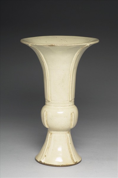 仿古銅觚式,撇口,長頸, 鼓腹,腹部外撇,矮圈足,四出戟裝飾。全器施白釉,釉面佈滿開片紋。足與底均無釉露胎呈褐色,舊稱廣窯作品。