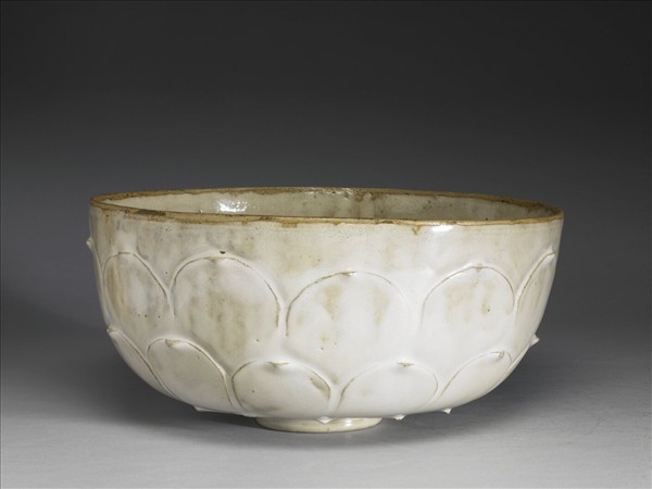 大碗直口,深壁,矮圈足。全器施白釉,以覆燒方式製作,口緣露胎,胎質緻密色黃,外壁飾以貼花雙層蓮瓣紋,瓣尖浮塑出器表,碗心飾貼花蓮花紋,舊稱廣窯作品。