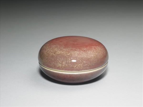 扁圓形盒,子母口,底坐於圈足上。器裡透明釉,器壁滿施銅紅釉,呈色稍淡,有綠色斑。圈足內白地青花「大清康熙年製」三行六字楷款。此器一式十件,同儲於一木盒。