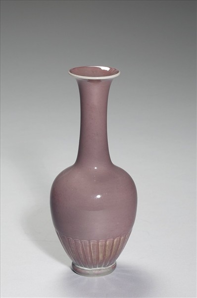 撇口長頸,豐肩下斂,有圈足。整器除腹壁下半部菊瓣紋一圈外,通體皆無紋飾。器罩施紅釉,但菊瓣上釉色較淡,口緣與腹足交界處各留白一圈。器外底白地青花「大清康熙年製」三行六字楷款。