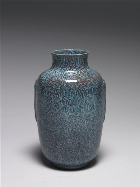 微侈口,短頸,斜肩,筒腹,雙高足盃形貼花暗耳,矮圈足。全器施爐均釉,呈深淺藍色不規則流釉狀,釉面平滑。足緣呈鐵黑色。底有陰刻「大清乾隆年製」三行篆書款。