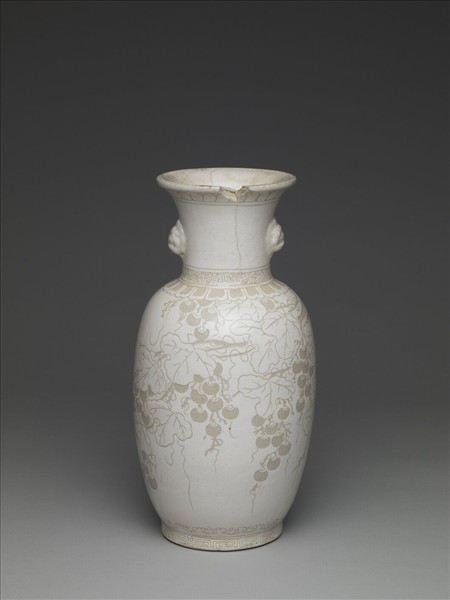 撇口,直頸,雙獸首耳,圓肩,長腹下微斂,圈足。全器敷白色化妝土,以剔花方式將部分的化妝土剔除,露出底下的淺褐色胎土,形成圖案。口沿飾一圈花瓣紋,頸部飾一圈卍字紋及蓮瓣紋,腹部飾葡萄藤及葡萄紋,近圈足處飾一圈如意雲紋,圈足飾一圈回紋。圈足底緣及外底露胎,呈淺褐色。