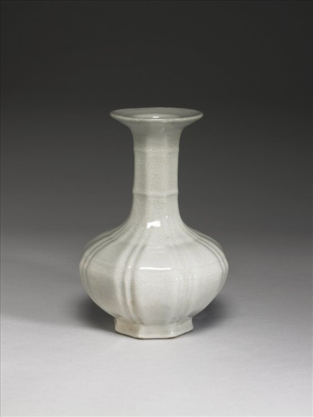 盤口,直長頸,碩腹,全器作八棱形,八方圈足。通體施哥釉,色粉青瑩潤,密佈淺色開片紋,頸與肩有起線弦紋共三道。圈足露胎,塗淺棕色汁,底心有「大清乾隆年製」青花三行六字篆款。