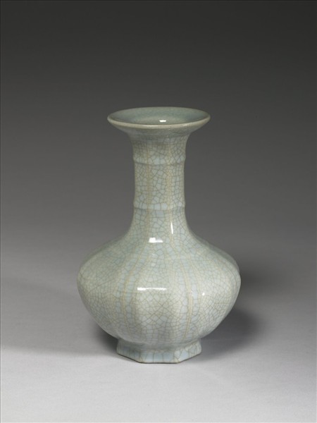盤口,直長頸,碩腹,全器作八棱形,八方圈足。通體施哥釉,色粉青瑩潤,密佈淺色開片紋,頸與肩有起線弦紋共三道。圈足露胎,塗淺棕色汁,底心有「大清乾隆年製」青花三行六字篆款。