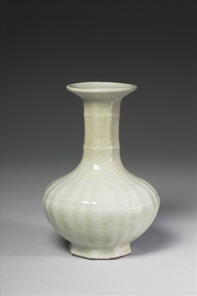 盤口,直長頸,碩腹,全器作八棱形,八方圈足。通體施哥釉,色粉青瑩潤,密佈淺色開片紋,頸與肩有起線弦紋共三道。圈足露胎,塗淺棕色汁,底心有「大清乾隆年製」青花三行六字篆款。