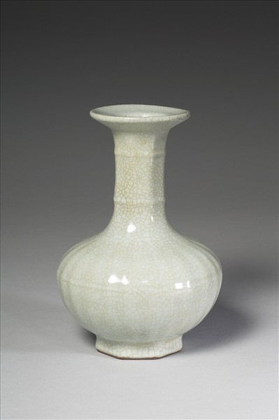 盤口,直長頸,碩腹,器身圓而微作八瓣式,八方形圈足。通體施哥釉,色粉青光亮,密佈淺色開片紋,器身飾直楞紋八對,頸與肩有起線弦紋共三道。圈足露胎,塗淺棕色汁,底心有「大清乾隆年製」青花三行六字篆款。