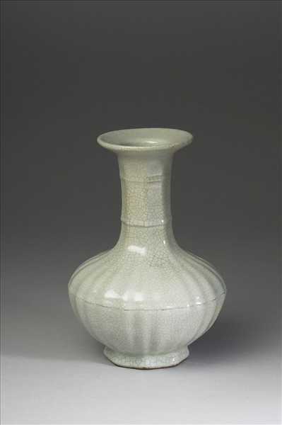盤口,直長頸,碩腹,器身圓而微作八瓣式,八方形圈足。通體施哥釉,色粉青光亮,密佈淺色開片紋,器身飾直楞紋八對,頸與肩有起線弦紋共三道。圈足露胎,塗淺棕色汁,底心有「大清乾隆年製」青花三行六字篆款。