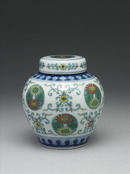 圓直口,口微斂,肩部略豐,碩腹下斂,平底凹足,帶蓋。器壁繪圓形菊花花葉紋,圓形菊花紋間則飾以纏枝番蓮紋,兩種紋飾順次交錯,恰成二圈滿布器壁。器壁上下覆有如意雲頭紋一圈。蓋面亦飾一團菊花,蓋周則為四組蓮花紋。足內有白地青花「大清乾隆年製」三行六字篆款。