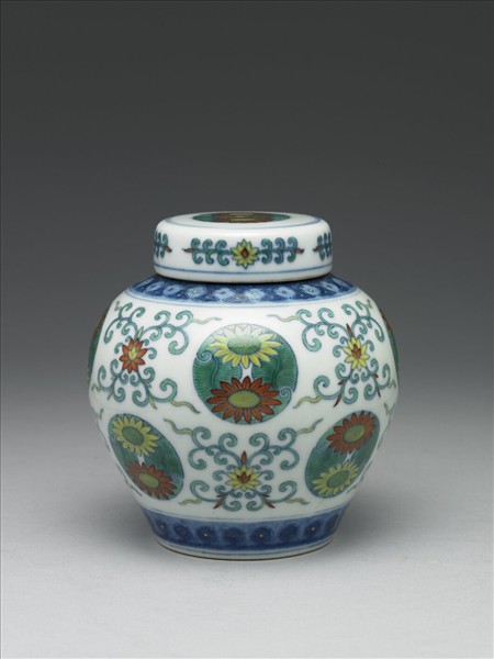 圓直口,口微斂,肩部略豐,碩腹下斂,平底凹足,帶蓋。器壁繪圓形菊花花葉紋,圓形菊花紋間則飾以纏枝番蓮紋,兩種紋飾順次交錯,恰成二圈滿布器壁。器壁上下覆有如意雲頭紋一圈。蓋面亦飾一團菊花,蓋周則為四組蓮花紋。足內有白地青花「大清乾隆年製」三行六字篆款。