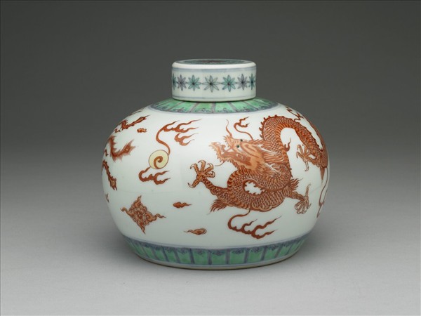 小圓口,短頸,寬肩,圓腹,凹足,帶平頂圓蓋。蓋頂彩繪菊花一朵,蓋壁飾八瓣花一周;罐肩及底邊各飾蓮瓣紋一圈,罐腹為紅彩一龍一鳳各戲一珠。胎骨略重,質白細緻,底青花書「大清康熙年製」六字二行楷款,外加雙圈。