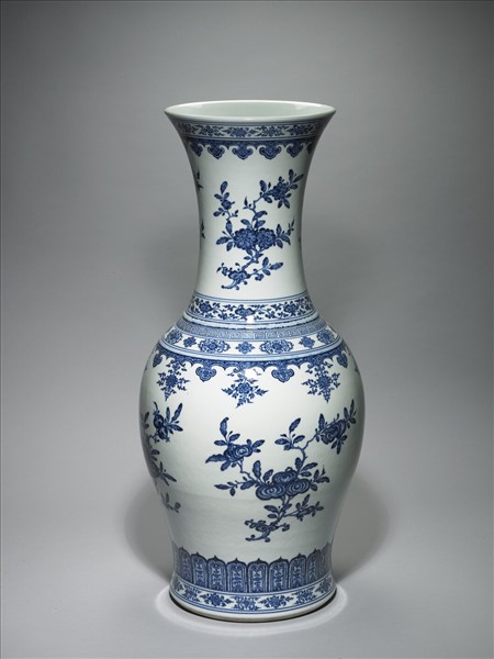 敞口,長頸,弧腹漸收,凹足。器頸及器腹主紋均繪折枝四季花朵紋,口沿、肩及底邊則分飾花卉、回紋、朵花、蓮瓣、圖案花等紋飾。底青花書「大清雍正年製」篆書款。