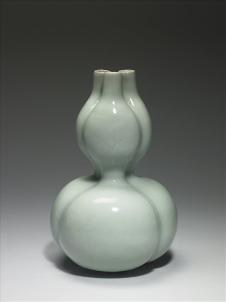 三連葫蘆瓶,器成「品」字形,由三葫蘆併接而成,三瓣形足。全器施罩冬青釉,釉色勻淨瑩潤,圈足露胎,塗褐色護胎汁,足內青花書「大清乾隆年製」三行六字篆款。