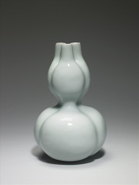 三連葫蘆瓶,器成「品」字形,由三葫蘆併接而成,三瓣形足。全器施罩冬青釉,釉色勻淨瑩潤,圈足露胎,塗褐色護胎汁,足內青花書「大清乾隆年製」三行六字篆款。