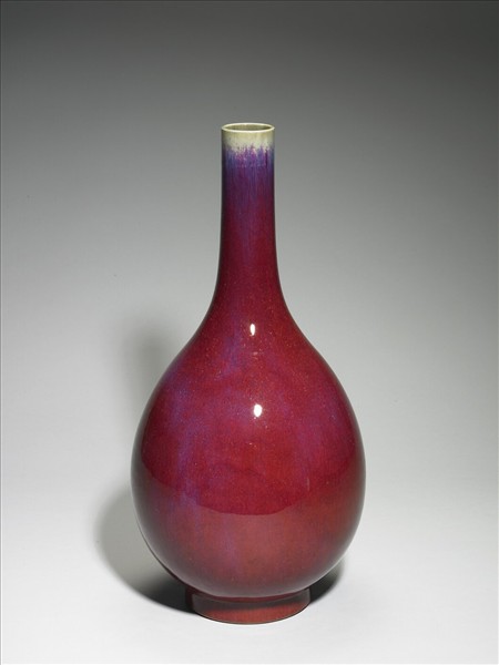 圓口,長直頸,腹垂如膽,圈足。器壁除口緣露白外,皆罩霽紅釉,紅釉中微見紫藍色,口緣露白,紅釉薄處多見紫紅釉交雜。足內刻「大清乾隆年製」三行六字篆款。