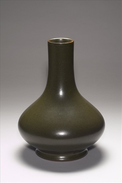 圓口略侈,直長頸,碩腹,圈足。通體施茶葉末釉,光素無紋飾。底亦施茶葉末釉,中印「大清乾隆年製」三行六字篆款。