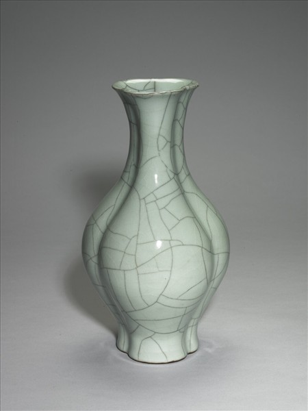 器呈三連瓶,花口外撇折唇,足亦為三瓣花形。 整器形為三小瓶併連,束頸碩腹,瓶與瓶接連處內凹,通體施青釉,滿佈開片。圈足露胎,塗褐色護胎汁,足內青花書「大清乾隆年製」三行六字篆款。