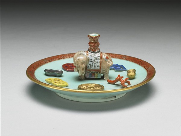 此香插主要部分為一淺碟,碟心立一馴象,其四周貼飾道教八寶一古錢、雙錢、銀錠、單錢、犀角、方勝、金錠、珊瑚,共八樣。象背裝飾尊式瓶,喻意「太平有象」。古錢上有「天下太平」的文字。碟子的內外塗湖綠釉,碟沿紅地繪捲枝花葉一周。器底湖綠釉上書「大清乾隆年製」三行六字描紅篆款。
