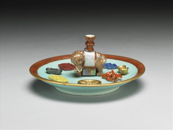 此香插主要部分為一淺碟,碟心立一馴象,其四周貼飾道教八寶一古錢、雙錢、銀錠、單錢、犀角、方勝、金錠、珊瑚,共八樣。象背裝飾尊式瓶,喻意「太平有象」。古錢上有「天下太平」的文字。碟子的內外塗湖綠釉,碟沿紅地繪捲枝花葉一周。器底湖綠釉上書「大清乾隆年製」三行六字描紅篆款。