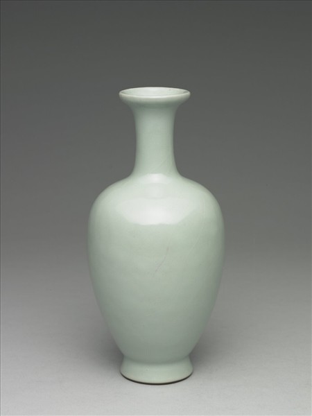 撇口,長頸,圓肩,圓腹,圈足外撇。全器施青釉,呈冬青色,釉面上有粗疏開片裂紋。足緣呈深褐色。底施青釉藍書「大清乾隆年製」三行篆書款。