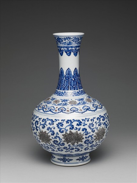 撇口,細頸,圓腹,圈足外撇。口緣飾纏枝靈芝紋、如意雲紋,頸部繪蕉葉、卷葉紋,肩飾轉枝番蓮、如意雲紋,腹部以纏枝番蓮、蓮瓣紋為飾,圈足飾朵花紋。全器紋飾除番蓮紋及肩部的朵花紋為銅紅料所繪之釉裏紅紋飾之外,其餘皆以鈷料彩繪青花紋樣。底為白地青花書「大清乾隆年製」三行六字篆款。此瓶型始燒於雍正時期,至乾隆朝仍盛燒不歇。