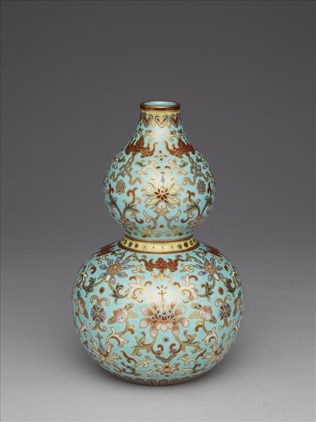 器作葫蘆形,直口,短頸,束腰,凹足。全器以淺藍色釉為地,上繪洋彩圖案且以金彩勾邊。器身紋樣自上而下為蝙蝠、卍字、番蓮及桃紋,口沿繪一圈如意雲紋,腰部飾連珠紋,腹下飾一圈蓮瓣紋。足底緣露胎,胎色潔白,底施藍釉以金彩書「大清嘉慶年製」六字三行篆款。
