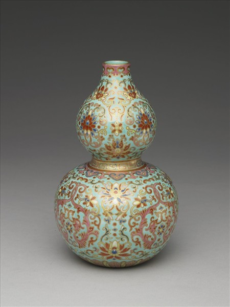 器作葫蘆形,直口,短頸,束腰,凹足。全器施淺藍色釉,上繪五彩圖案且以金彩勾邊。上半部繪團番蓮花紋四個形如開光的效果,隙地間飾朵花紋及番蓮紋;下半部繪團夔鳳紋四個,四對粉紅夔鳳,隙地間飾番蓮紋,口沿飾一圈如意雲紋,腰部繪回紋及如意雲紋,腹下飾一圈蓮瓣紋。足底緣露胎,胎色潔白,底藍釉以金彩書「大清嘉慶年製」六字三行篆款。
