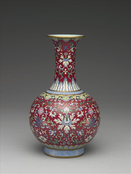 撇口細頸,圓腹,圈足。全器施紫色釉為地,上繪洋彩纏枝番蓮花紋,口緣飾如意雲紋,頸繪卍字紋、番蓮紋、卷葉紋及蕉葉紋,肩飾連續卍字紋、如意雲紋,腹部繪纏枝番蓮花、盤長及桃紋,腹下飾一圈蓮瓣紋,圈足飾回紋一周。圈足底緣露胎,胎色潔白,底施淺藍色釉,以紅料書「大清嘉慶年製」三行六字篆款。