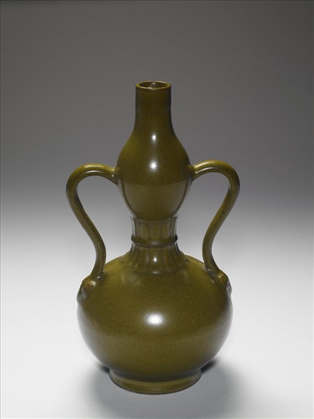 葫蘆形瓶,小口,圈足,有綬帶形耳一對,耳端有雲頭紋。通體施茶葉末釉,收腰處飾仰覆蓮瓣紋各一圈。圈足露胎,底心鈐「大清乾隆年製」三行六字篆款。