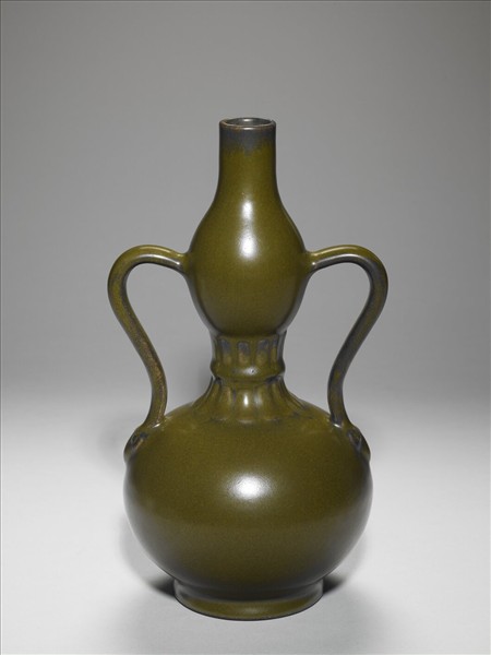 葫蘆形瓶,小口,圈足,有綬帶形耳一對,耳端有雲頭紋。通體施茶葉末釉,收腰處飾仰覆蓮瓣紋各一圈。圈足露胎,底心鈐「大清乾隆年製」三行六字篆款。