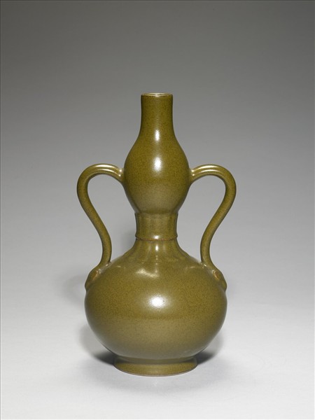 葫蘆形瓶,小口,圈足,有綬帶形耳一對,耳端有雲頭紋。通體施茶葉末釉,收腰處飾仰覆蓮瓣紋各一圈。圈足露胎,底心鈐「大清乾隆年製」三行六字篆款。