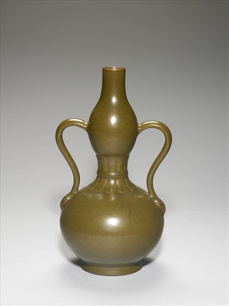 葫蘆形瓶,小口,圈足,有綬帶形耳一對,耳端有雲頭紋。通體施茶葉末釉,收腰處飾仰覆蓮瓣紋各一圈。圈足露胎,底心鈐「大清乾隆年製」三行六字篆款。