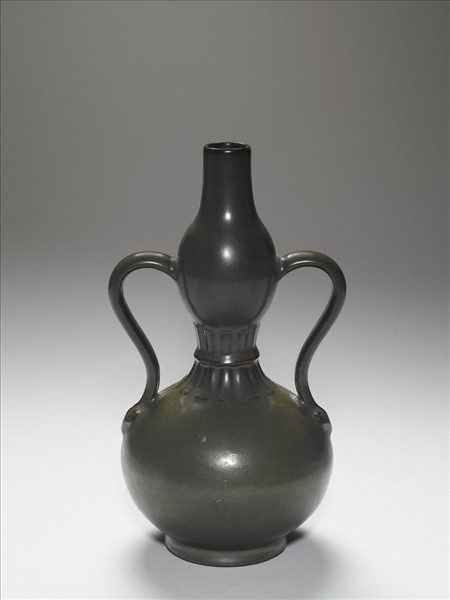 葫蘆形瓶,小口,圈足,有綬帶形耳一對,耳端有雲頭紋。通體施茶葉末釉,收腰處飾仰覆蓮瓣紋各一圈。圈足露胎,底心鈐「大清乾隆年製」三行六字篆款。