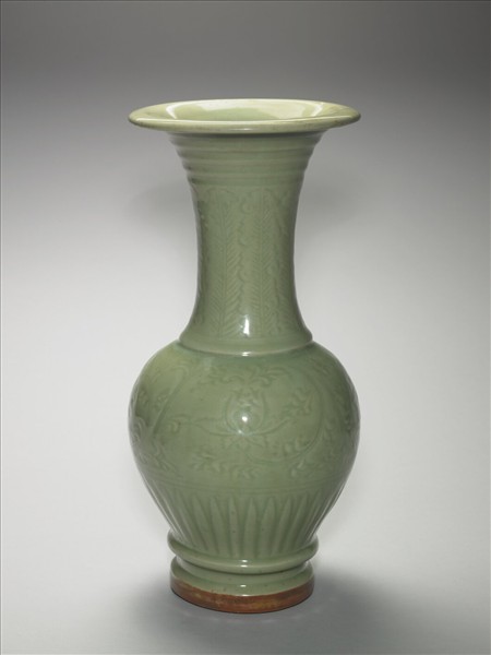 鳳尾瓶,喇叭狀撇口、長頸、圓肩、斂腹,脛下束以雙凸棱。外壁劃花為飾,口下四道凸弦紋,下接長蕉葉,腹部完纏之番蓮紋,腹下長蓮瓣紋。足圈斜削成,足圈無釉,底部明顯為最後釉接另塊泥板而成。十六世紀晚期開始,江南地區的文人逐漸將花藝與花器納入日常生活常規,不僅營造古雅氛圍也鑑賞花瓶。依照文震亨的說法,較高的龍泉窯瓶適合插梅花。