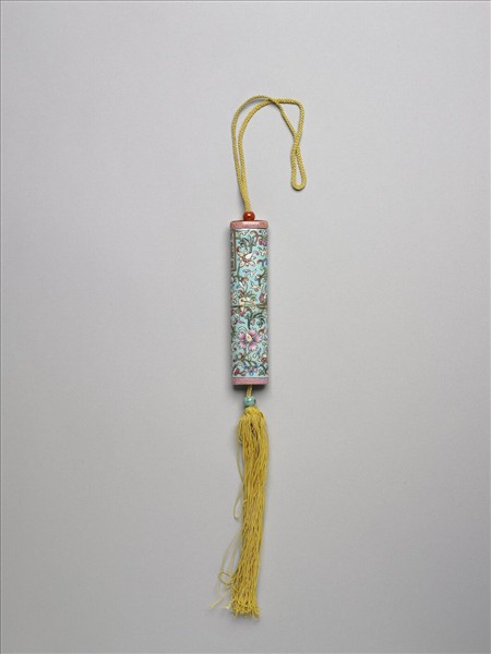 瓷牙籤筒,筒作扁圓形,中空以裝牙籤,外壁彩繪纏枝花卉圖樣。一端可打開為器蓋,蓋上穿繩,接貫器底,出為絲穗,以固定、調整器蓋的開闔。整器外型模仿已收束齊整之畫卷,故器外壁中央繪有金線繞旋與牙白色別子,兩端以粉紅釉為地再裝飾紅色卷草紋一圈以示手卷之鑲邊。除此之外,外壁滿飾湖綠色底釉和纏枝番蓮紋,有如一卷包首華麗的手卷。又右上有長方形金框榜題,作黑色「萬壽無疆」四篆字,由此推測此器或是為祝壽而製作之物。