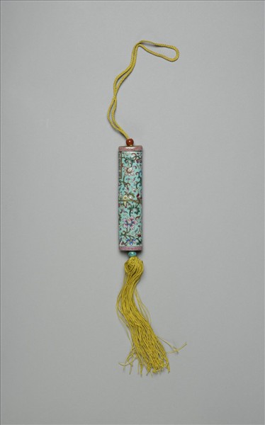 瓷牙籤筒,筒作扁圓形,中空以裝牙籤,外壁彩繪纏枝花卉圖樣。一端可打開為器蓋,蓋上穿繩,接貫器底,出為絲穗,以固定、調整器蓋的開闔。整器外型模仿已收束齊整之畫卷,故器外壁中央繪有金線繞旋與牙白色別子,兩端以粉紅釉為地再裝飾紅色卷草紋一圈以示手卷之鑲邊。除此之外,外壁滿飾湖綠色底釉和纏枝番蓮紋,有如一卷包首華麗的手卷。又右上有長方形金框榜題,作黑色「萬壽無疆」四篆字,由此推測此器或是為祝壽而製作之物。