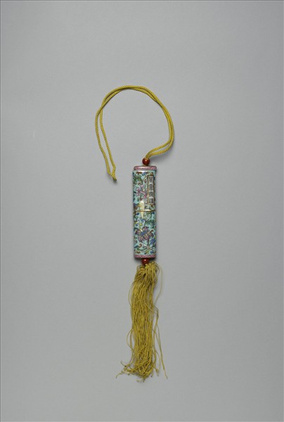瓷牙籤筒,筒作扁圓形,中空以裝牙籤,外壁以粉彩繪飾圖樣。一端可打開為器蓋,蓋上穿繩,接貫器底,出為絲穗,上下並各約以一紅色瓷珠。如此作法,便可固定、調整器蓋的開闔。整器外型模仿已收束齊整之畫卷,器外壁中央繪有金色線繞旋與白色別子,金線與別子均模製鼓起;兩端粉紅地紅色卷草紋一圈以示手卷之鑲邊;頂面與底面且繪紅地金彩螺旋紋,有如紙卷層疊狀。除此之外,外壁滿飾湖綠地纏枝番蓮,有如一卷包首華麗的手卷。又右上有長方形金框題籤,作白地黑色書「萬壽無疆」四篆字,或是為了祝壽而製作此器。