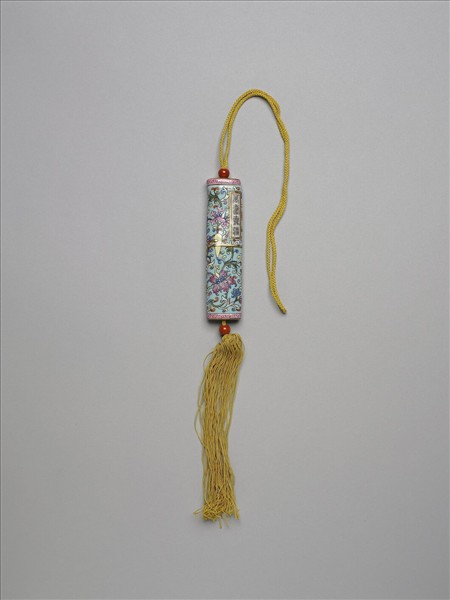 瓷牙籤筒,筒作扁圓形,中空以裝牙籤,外壁以粉彩繪飾圖樣。一端可打開為器蓋,蓋上穿繩,接貫器底,出為絲穗,上下並各約以一紅色瓷珠。如此作法,便可固定、調整器蓋的開闔。整器外型模仿已收束齊整之畫卷,器外壁中央繪有金色線繞旋與白色別子,金線與別子均模製鼓起;兩端粉紅地紅色卷草紋一圈以示手卷之鑲邊;頂面與底面且繪紅地金彩螺旋紋,有如紙卷層疊狀。除此之外,外壁滿飾湖綠地纏枝番蓮,有如一卷包首華麗的手卷。又右上有長方形金框題籤,作白地黑色書「萬壽無疆」四篆字,或是為了祝壽而製作此器。