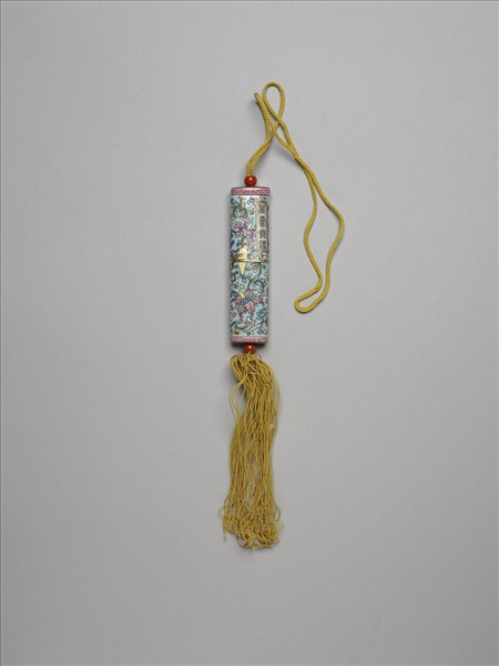 瓷牙籤筒,筒作扁圓形,中空以裝牙籤,外壁以粉彩繪飾圖樣。一端可打開為器蓋,蓋上穿繩,接貫器底,出為絲穗,上下並各約以一紅色瓷珠。如此作法,便可固定、調整器蓋的開闔。整器外型模仿已收束齊整之畫卷,器外壁中央繪有金色線繞旋與白色別子,金線與別子均模製鼓起;兩端粉紅地紅色卷草紋一圈以示手卷之鑲邊;頂面與底面且繪紅地金彩螺旋紋,有如紙卷層疊狀。除此之外,外壁滿飾湖綠地纏枝番蓮,有如一卷包首華麗的手卷。又右上有長方形金框題籤,作白地黑色書「萬壽無疆」四篆字,或是為了祝壽而製作此器。