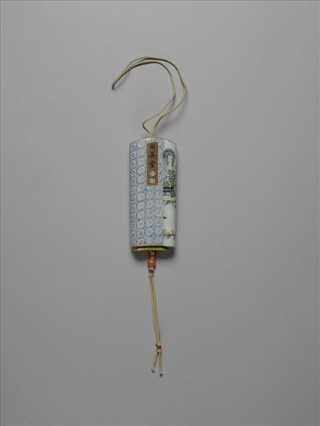 牙籤筒為私人用器,在上面題句寫詩,仿佛加蓋戳記以強調其私屬性。此器作扁長方形,分內外兩筒,內筒扁平、中空以裝牙籤,外筒狀若畫卷,當作器蓋來使用。兩筒之間並貫以絲繩,不用時兩筒可互套以便於收藏及攜帶。 即使小巧若此的作品,依然流露出一個「萃工逞能」的時代風格。所以外筒一面彩畫錦紋,製造仿如畫卷的包首,並以墨書題出「樂善堂」,而標題之下有硃紅描繪的「乾」、「隆」二印。另一面彩畫青綠山水。至於內筒,一面墨書御題詩,詩句之下以硃紅描繪「御」、「製」二印,另一面以硃紅將御題詩分繪成各式的印章。乾隆皇帝喜作詩,二十歲出版《樂善堂詩文集》,集中收錄者皆為登基之前的舊作。或許因為皇帝曾經親自交出詩稿,要督陶官唐英將之安置於轎瓶器表,故御窯廠為討聖上的歡心,遂連樂善堂詩文亦當作高尚文雅的圖飾,將之放在瓷器上。不過皇帝對於瓷器上應該出現何種詩作頗有自己的想法,他本人以為樂善堂詩不宜燒在器表,故於乾隆十七年(1752),親自交下御製詩四套,並告知唐英:「嗣後燒造瓷器,應用詩之處即用此詩撿選燒造,不必用樂善堂詩文」。由此可知,乾隆皇帝的確透過類似安放詩文的作法,來表達他關心官窯的燒造與生產。