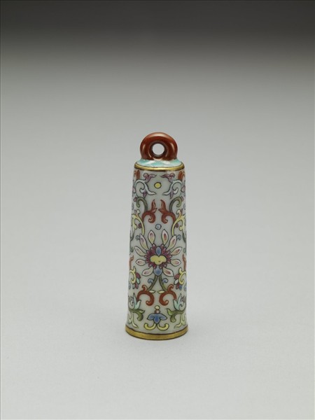 翎管,插飾羽翎的管狀飾物。平頂,直筒形,器身上小下大,中空,無底,以插翎其中;頂端帶環形繫,使與帽相銜。管身飾白地粉彩纏枝花卉,上下緣飾金邊。器裡作淺藍色。
